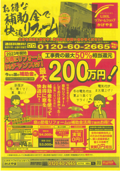今なら窓の省エネリフォームで、約50%相当の補助金が交付されます!