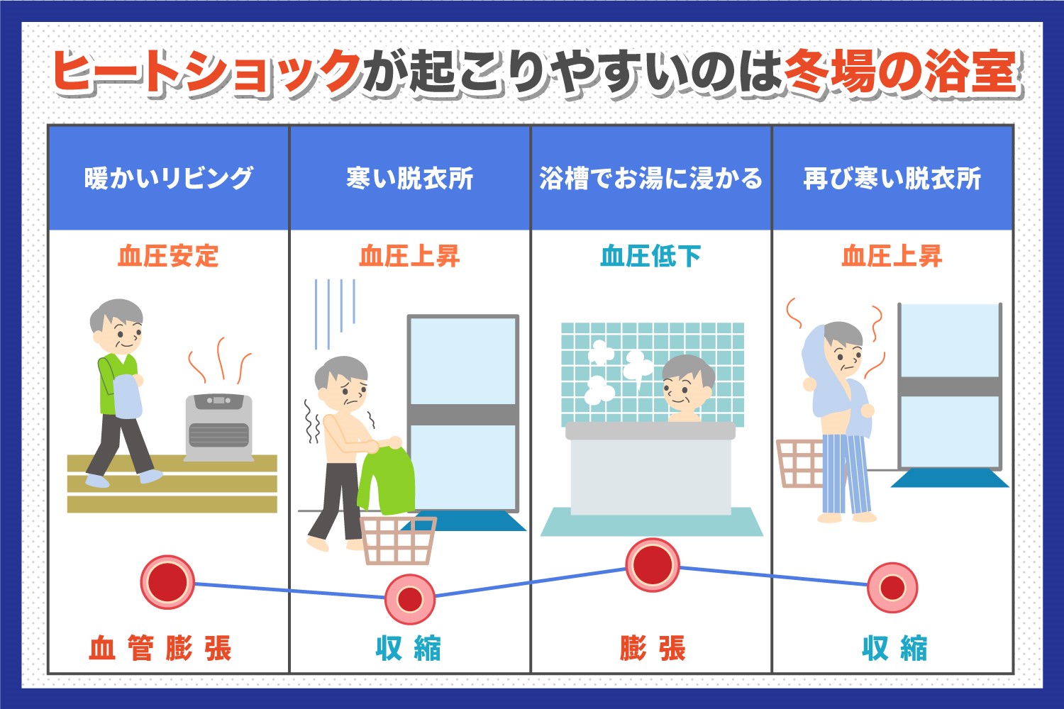 暖かいリビング→寒い脱衣室で裸になる→浴室で熱い湯舟に入る(血圧が上がる)