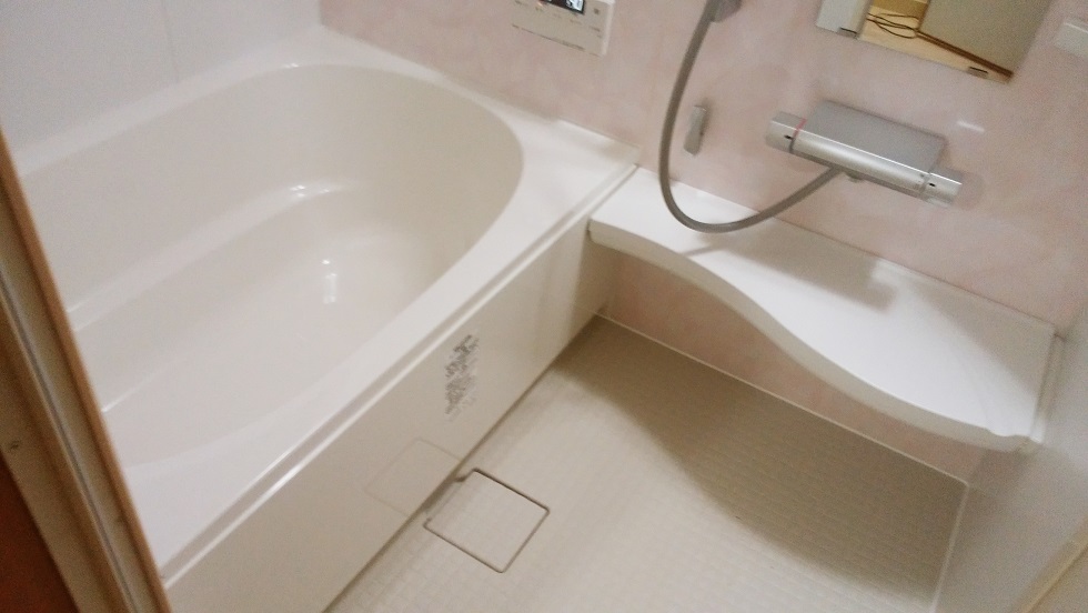 お風呂在来のタイル張りのお風呂からユニットバスへ交換。浴室暖房乾燥機付きで冬もあたたか!