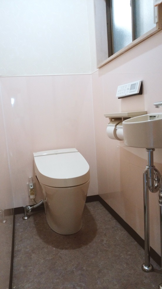トイレ汚れのつきにくい最新トイレを採用。室内も掃除がしやすいパネルを張り、温かみのある明るい雰囲気へ。