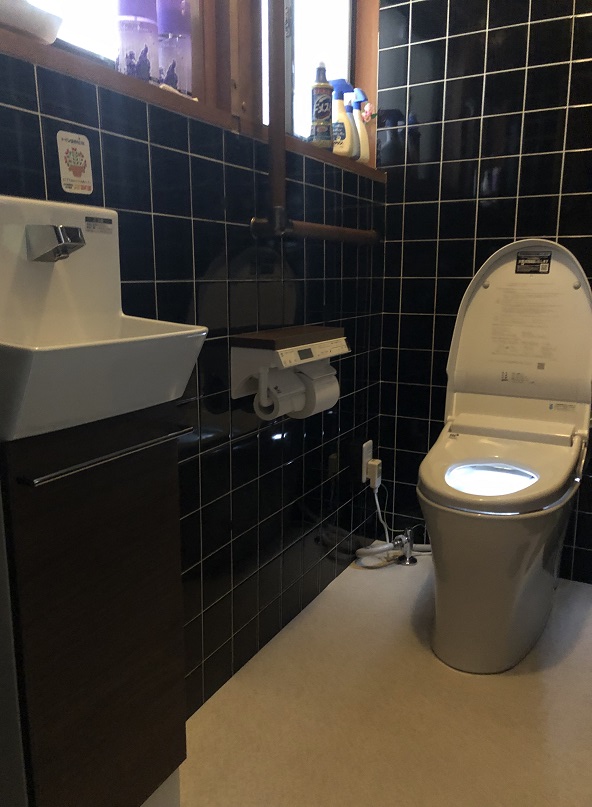 トイレ手前に男性用トイレ、奥に和式トイレのある状態から、最新の洋式トイレ1つにリフォーム。以前からあった手洗い器もスッキリとしたデザインの手洗い器へ付け替え、トイレが広くなりました。