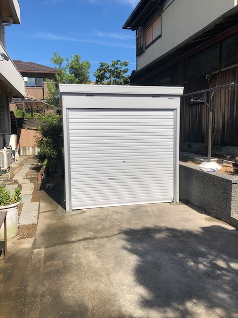 ・ご高齢ですが積極的に外出されるお施主様。電動カートに電動自転車を追加購入されるご予定で、2台を入れるガレージをご希望。防犯や台風被害を考慮し、カーポート型ではなく、しっかりとしたヨドコウの物置を設置しました。