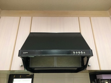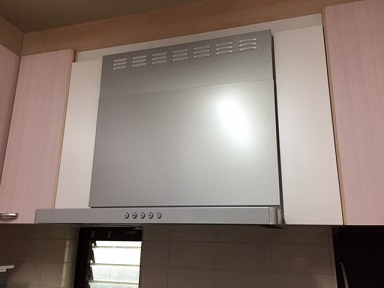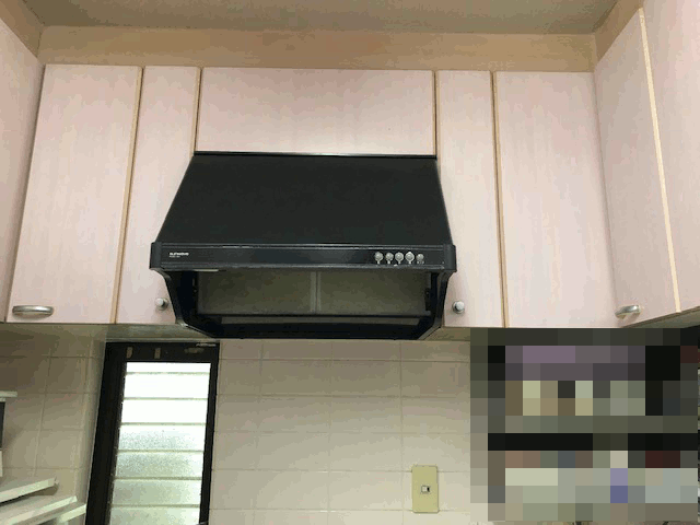 換気扇の音がうるさくなったレンジフードを、最新のレンジフードに交換。歪んでいた両脇の吊り戸も新しい物に交換。