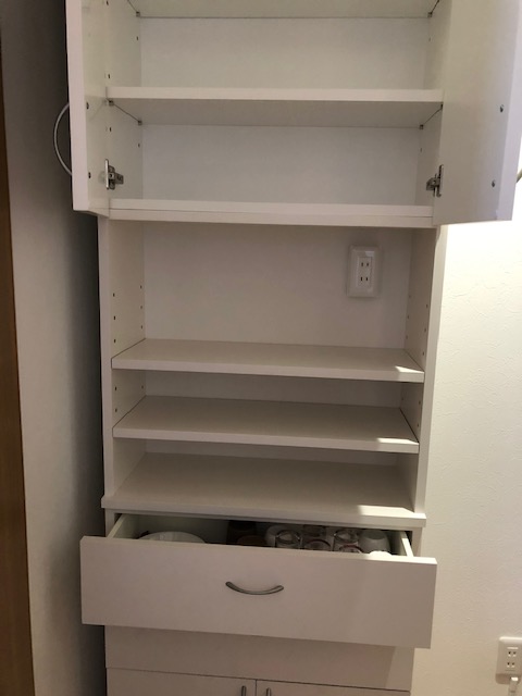 引き出し・開き棚・オープン棚を組み合わせて作成。