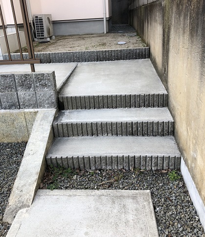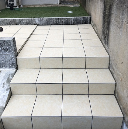 花壇に芝生を敷き、コンクリート部分にタイルを貼りました。