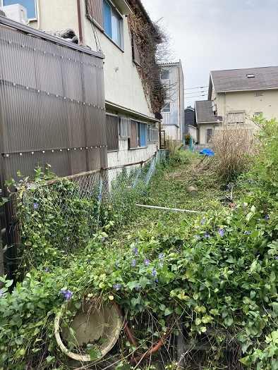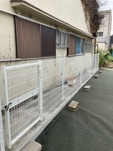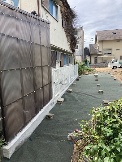 外回りは家とフェンスの隙間はコンクリートにし、草刈りをした上に防草シートを貼り付けました。