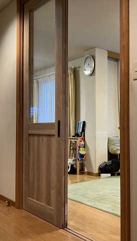 既存の開き戸を引き戸に交換し、段差をなくすリフォームをさせて頂きました。