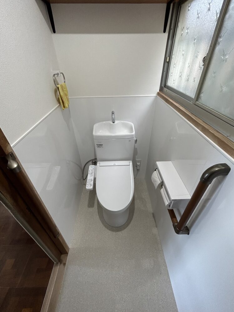 和式トイレから洋式トイレへの交換に伴い、壁紙や床材を貼り、段差を取って洋式トイレを設置しました。