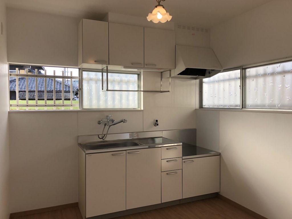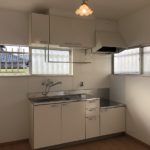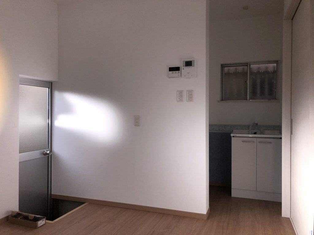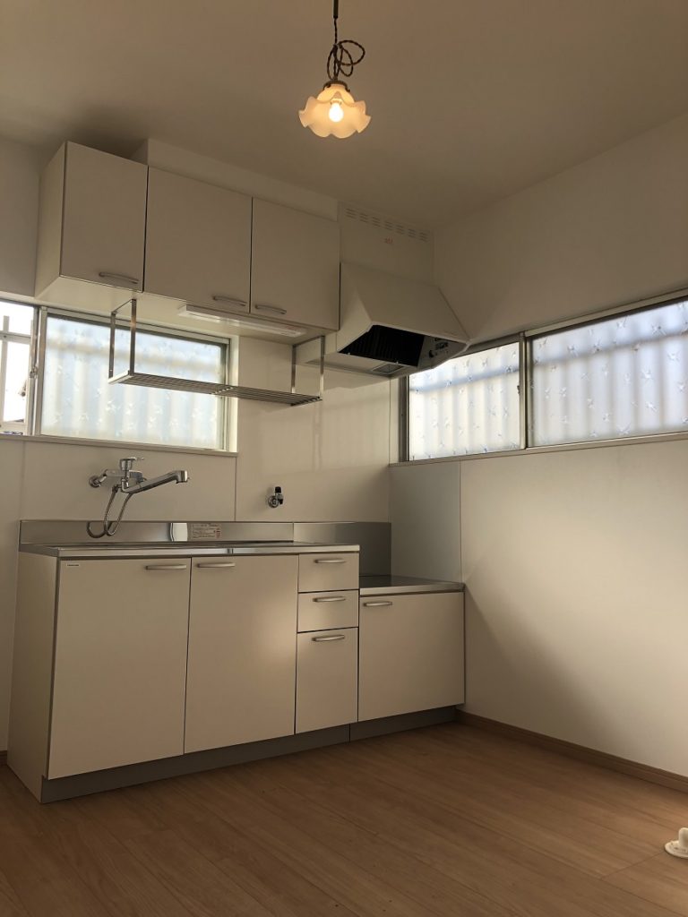 キッチンの配置を使い勝手の良い位置へ配置。クロスも全面貼替明るいキッチンになりました。