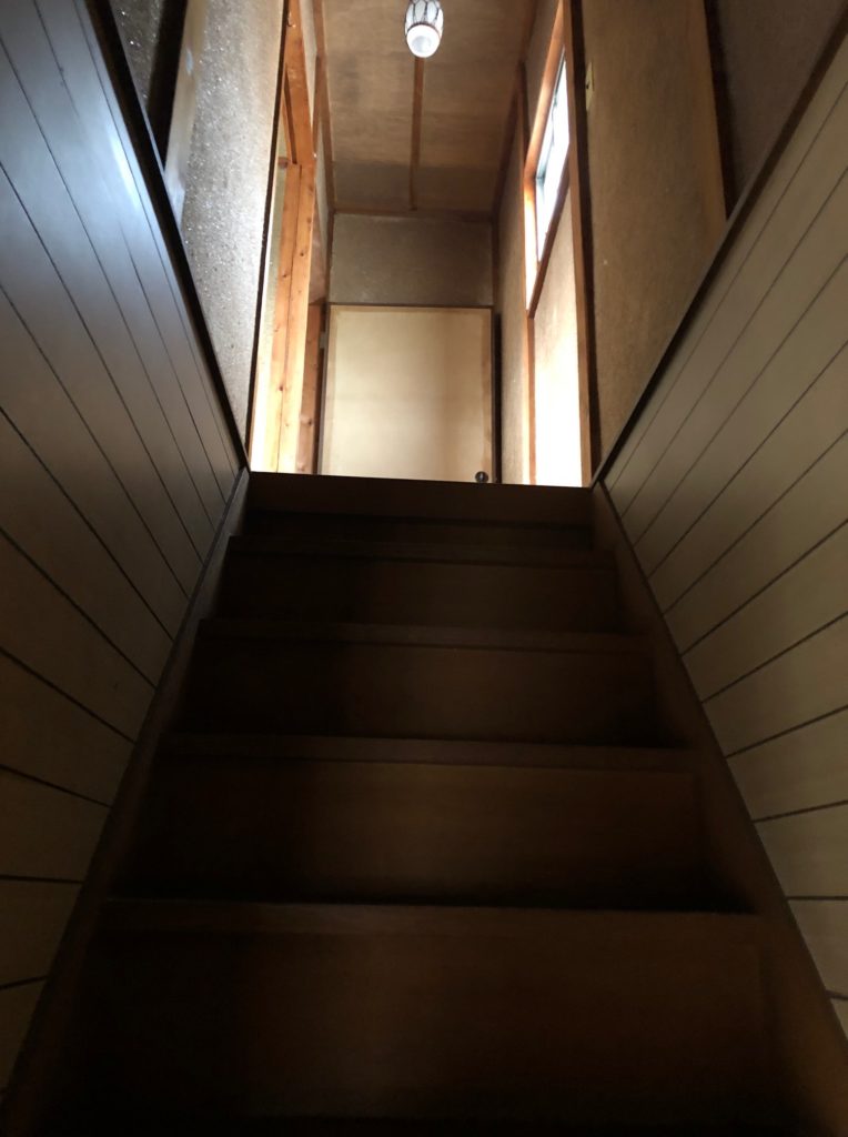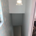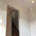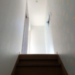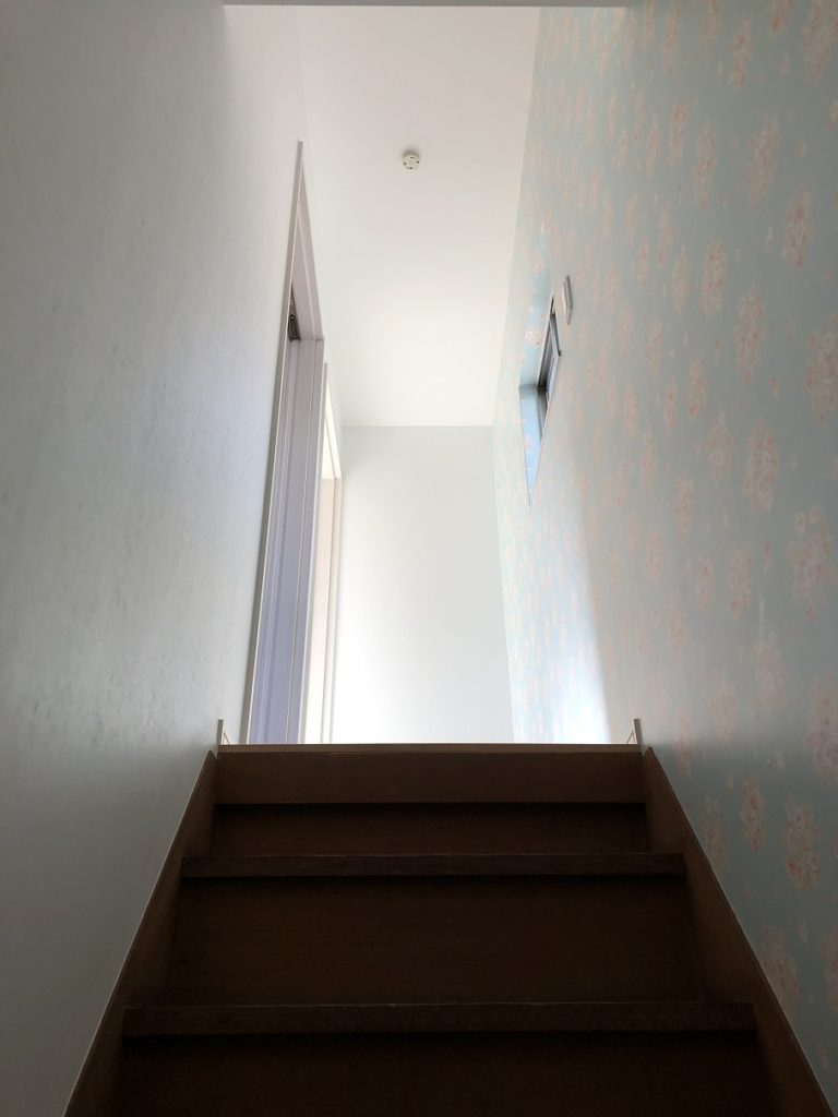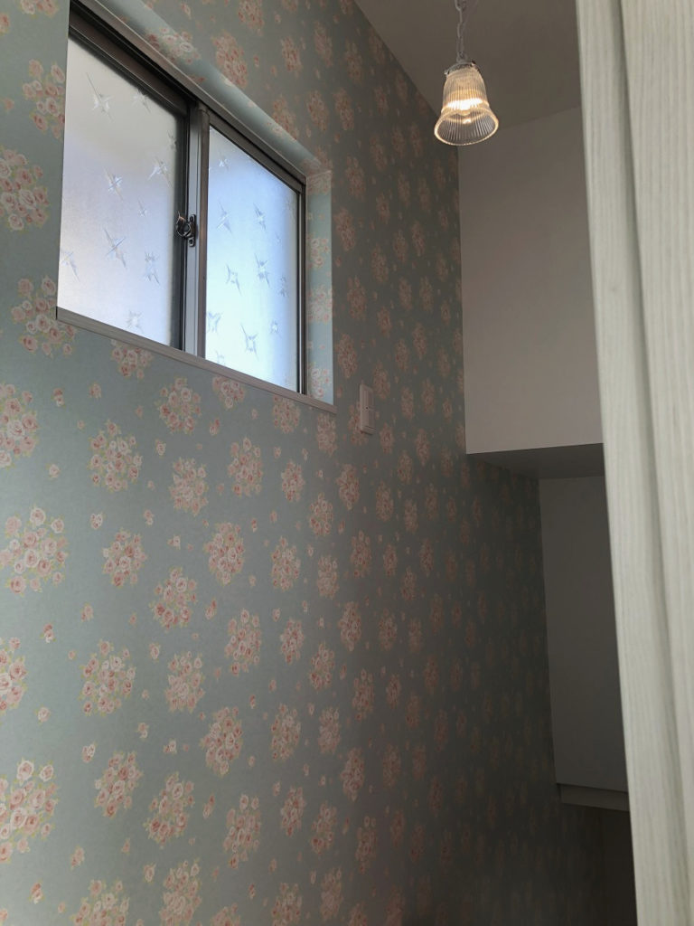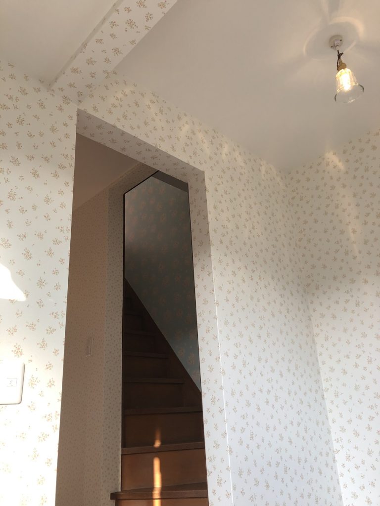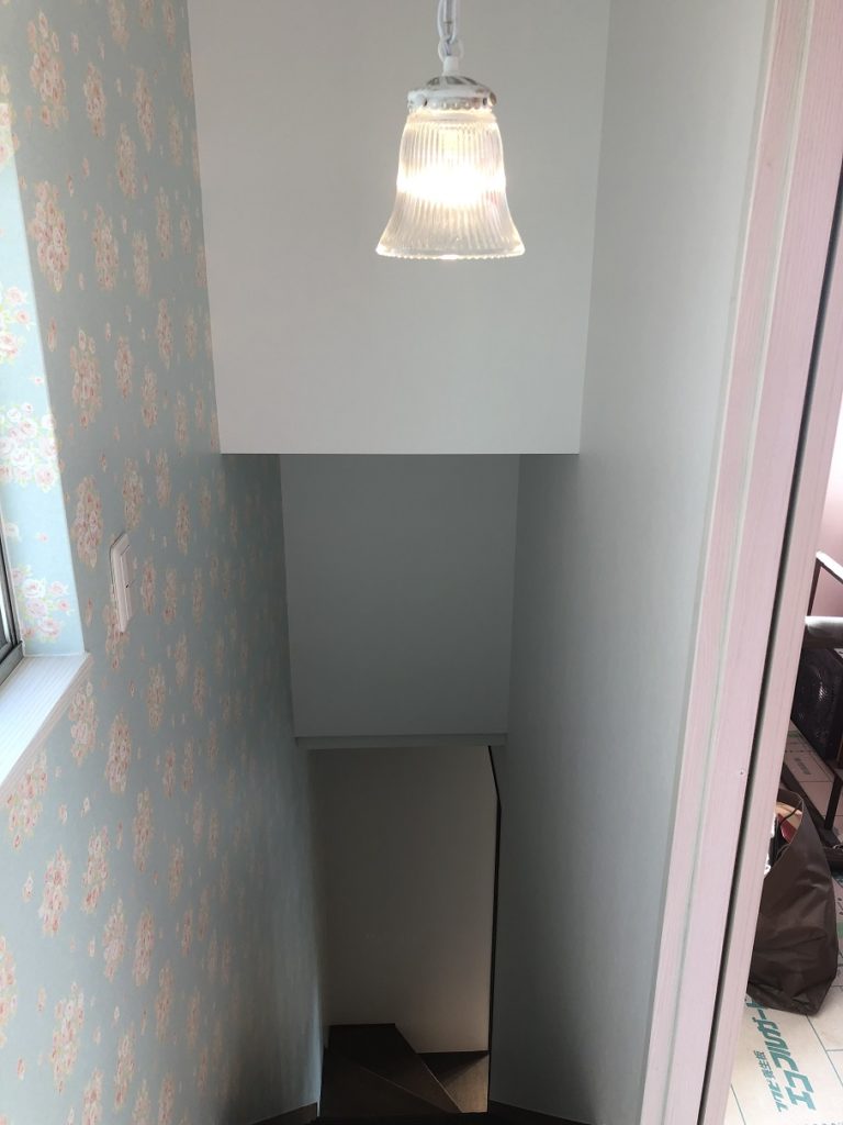 大きな花柄のクロスとお花のような照明の階段室。とても明るくなりました。