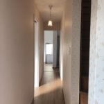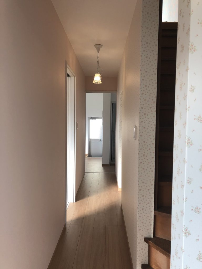 白系の壁紙で廊下がとても明るくなりました。照明がアクセントになっています。