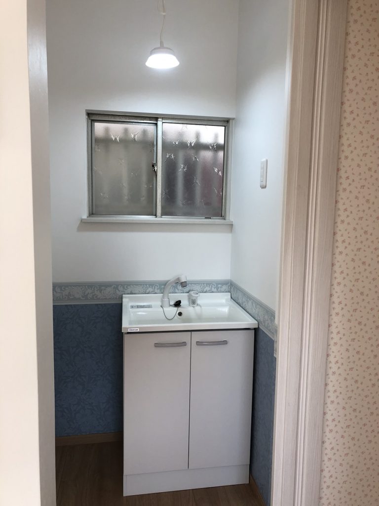 クリナップの洗面台を採用。白系とグリーン系のクロスをトリム施工しました。