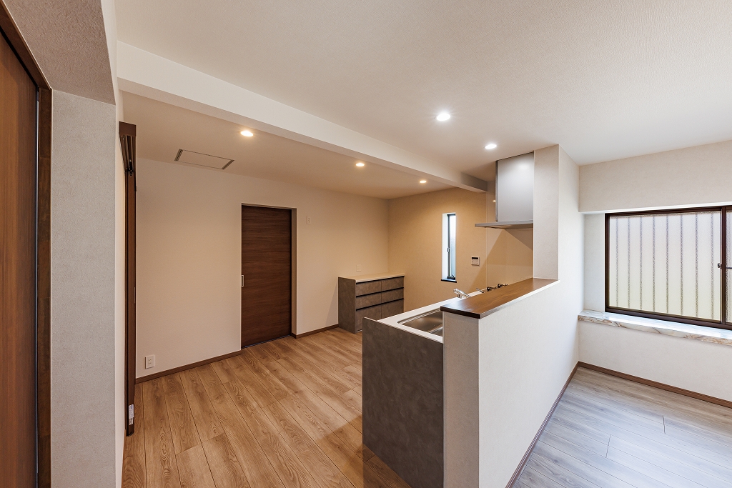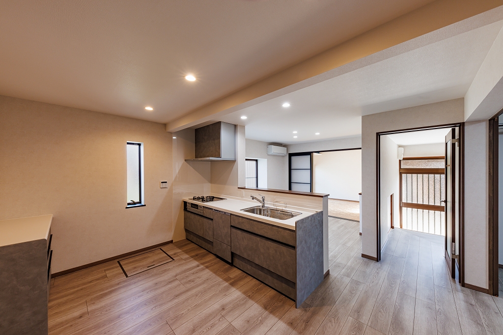 解放的なオープンキッチン。間取り変更で叶えた広々LDKリノベ